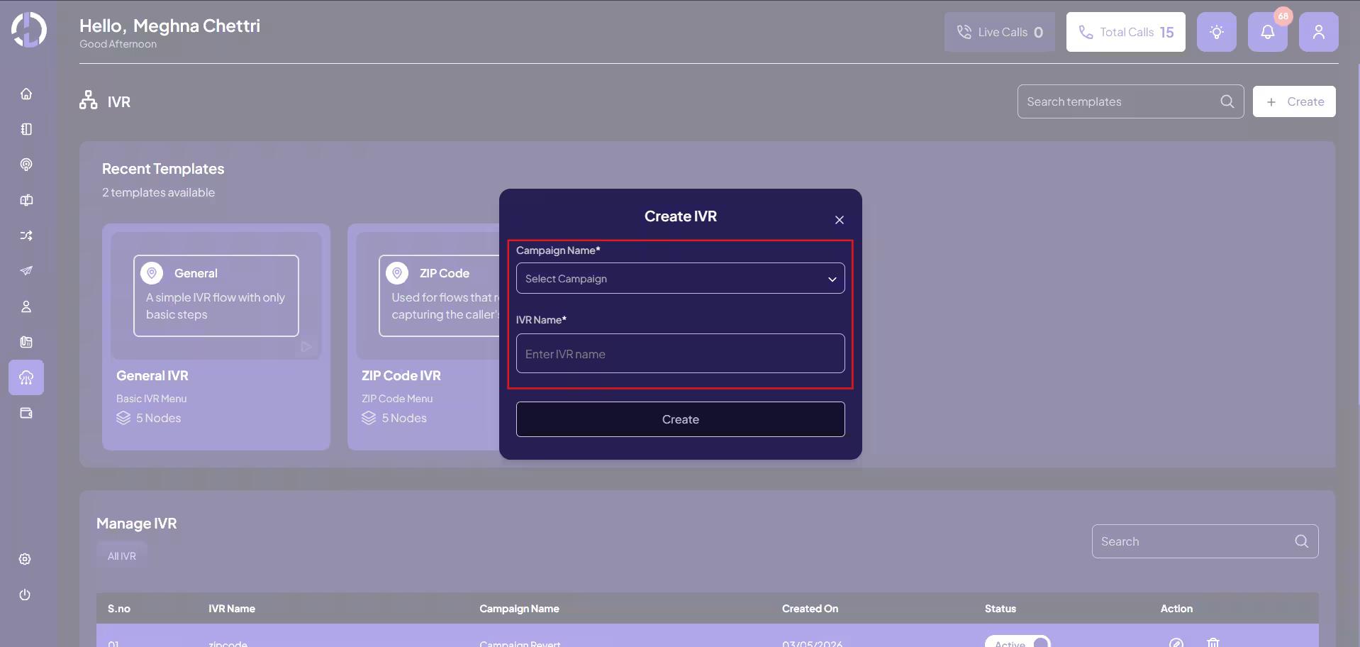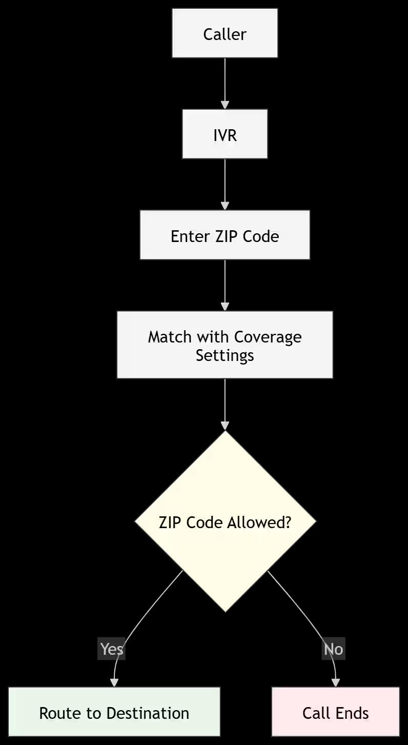 Coverage can be configured at three levels: Country, State, and ZIP Code. The level you select determines how broadly or specifically calls will be routed.
